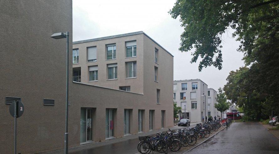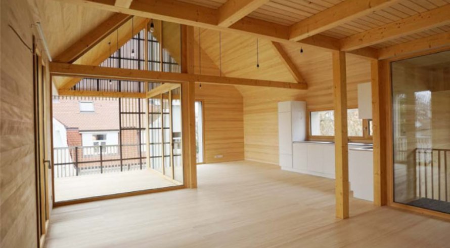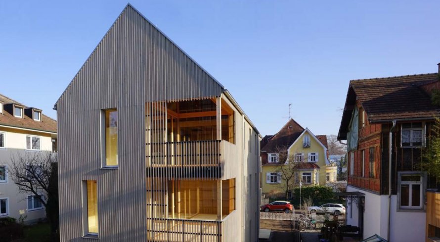 Das mehrgeschossige Wohngebäude ist als reiner Holzbau in massiver Fichte gebaut. Die 33 cm starken Außenwände sind in Ständerbauweise mit Holzfaserdämmung ausgeführt. Eine einseitige Diagonal-Verschalung dient sowohl als aussteifende Ebene, als auch als Dampfbremse. Die Fassade, Fenster, Böden und Decken sind aus massiver Weißtanne aus dem Schwarzwald gefertigt